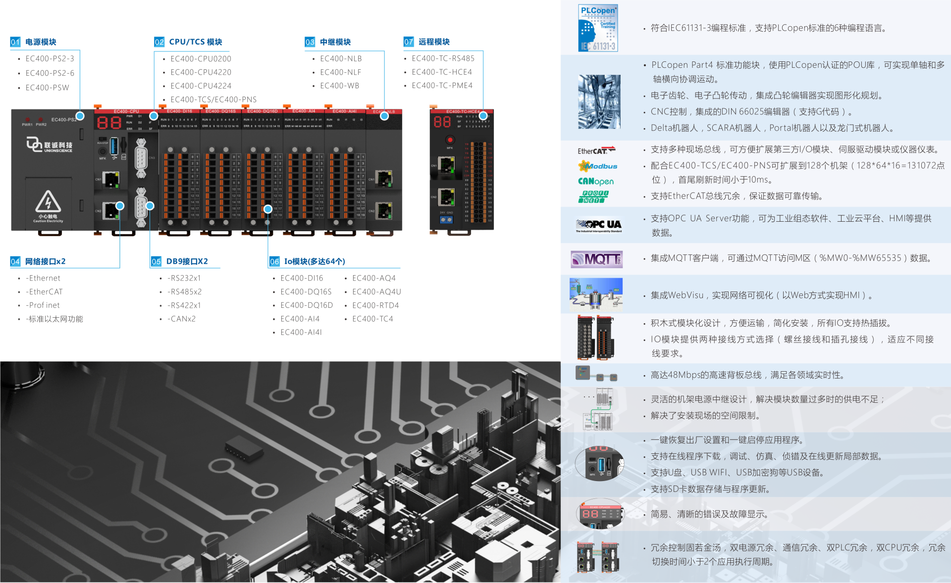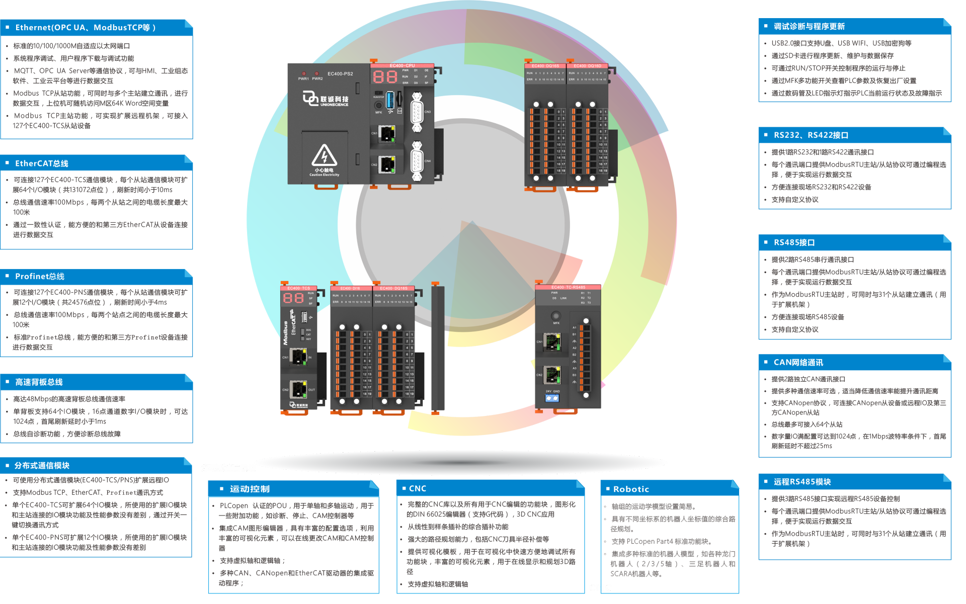 EC400系列PLC已形成基于4种不同硬件结构的30种型号的CPU模块,以及各类主流总线的远程I/O通信模块、数字量输入输出模块、模拟量输入输出模块、温度测量模块、脉冲定位模块以及高速计数模块等等,同时软硬件可根据用户需求进行定制化开发。