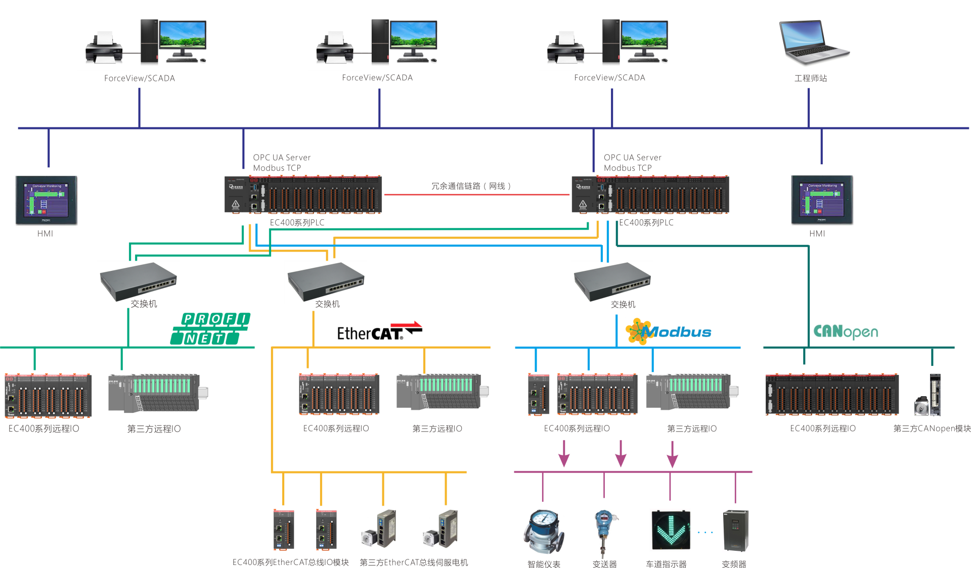 EC400系列PLC除了传统PLC的各项要求外还着重考虑了互联互通,针对工业现场,其可通过 EtherCAT、Modbus TCP、Profinet、Modbus RTU、CANopen等多种工业现场总线进行远程机架扩展以及与第三方设备互联;针对工业组态,其可通过OPCUA Ser ver、Modbus TCP、Modbus RTU、MQTT等标准通信协议以及用户自定义网络协议与各种工业组态软件进行数据交互。